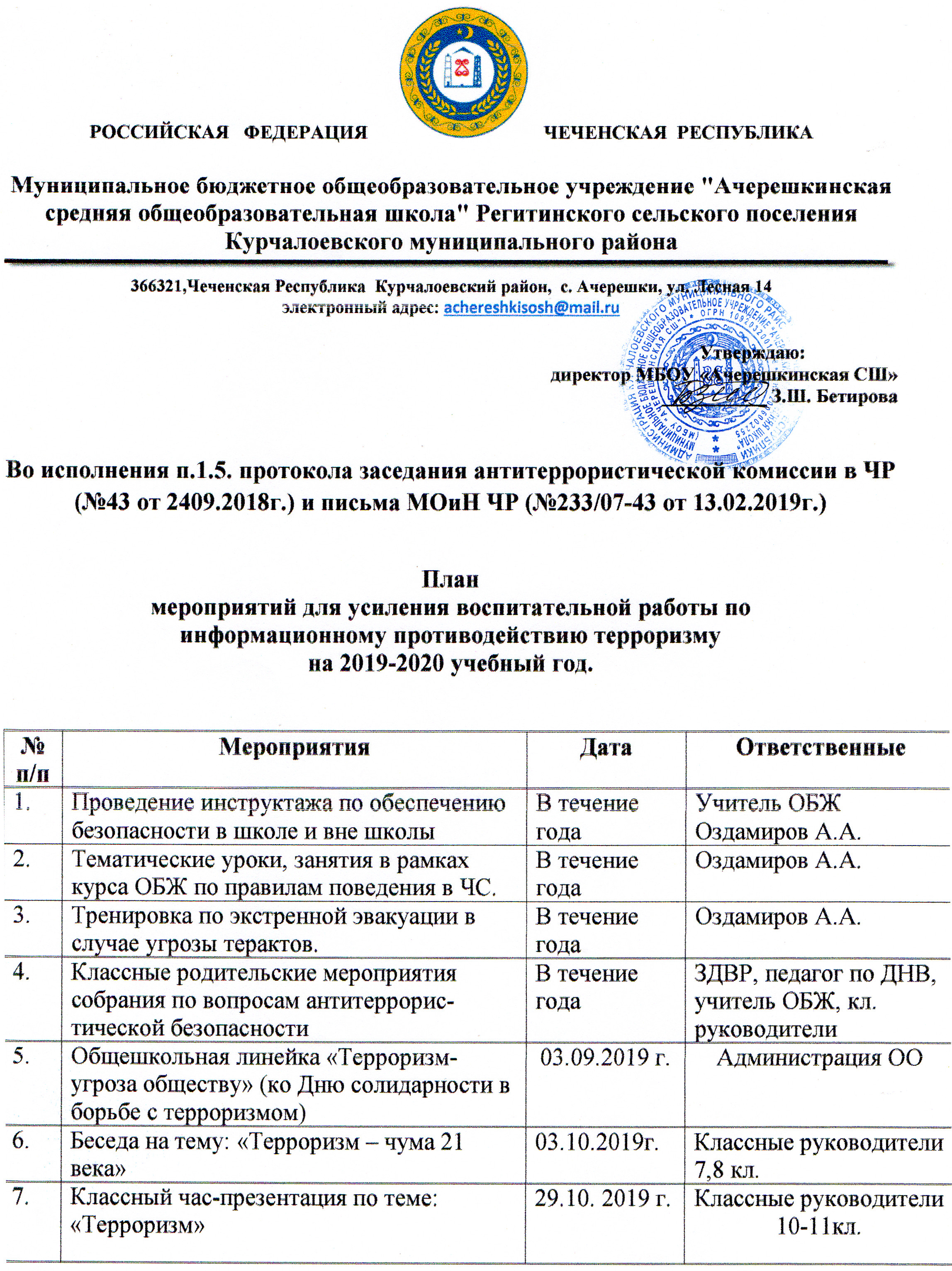 Отчеты на 2020-2021 учебный год. Информация о проведенных мероприятиях во исполнение решений заседания постоянно действующей рабочей группы АТК в ЧР по противодействию терроризму в сфере образования и науки от 23 июня 2020 года.Скачать Исполнение протокольного поручения Главы Чеченской Республики Кадырова Р.А. за №01-04 от 27.01.2015 года Отчёт о проведенной беседе на тему "Терроризм - чума 21 века".Скачать