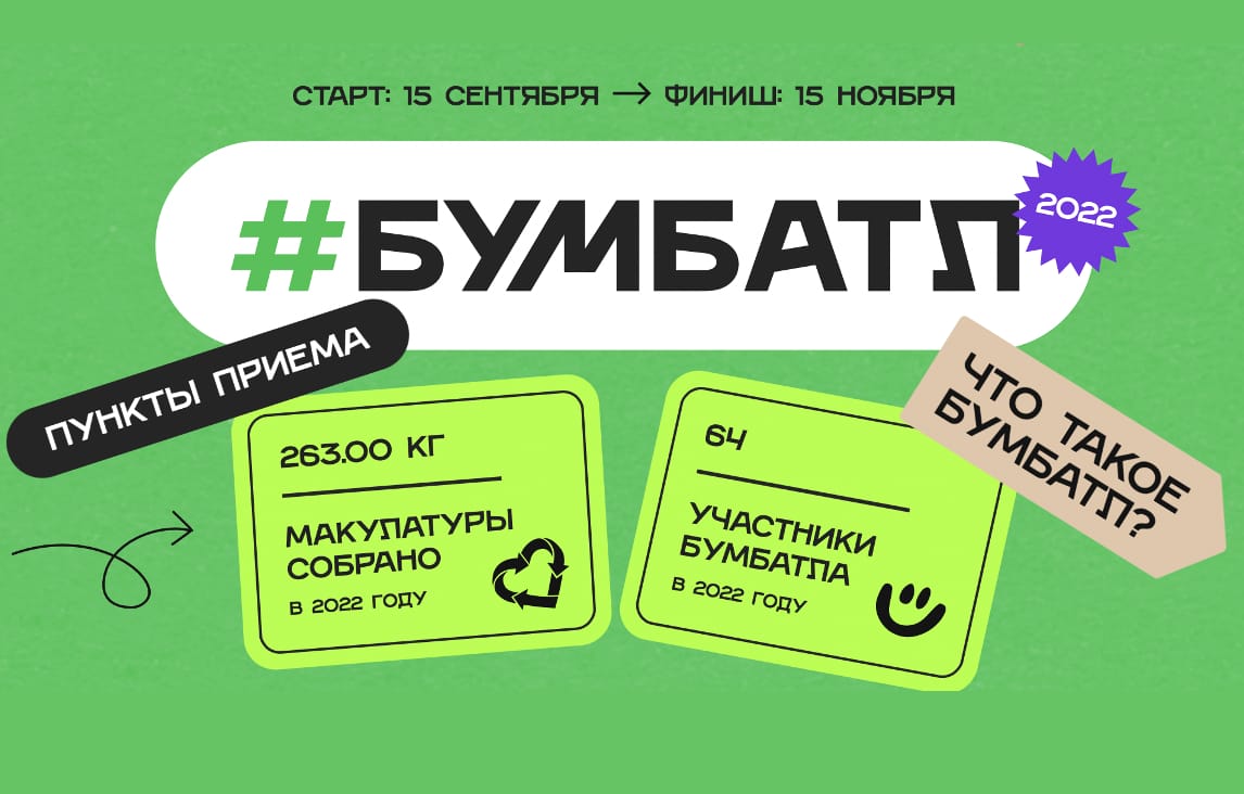 22.09.2022БУМБАТЛ - это возможность проявить заботу о природе, сдав бумагу на переработку. Но, как и любой батл, это еще и соревнование по количеству собранной макулатуры! Бумагу можно сдать в детских садах, школах, вузах, колледжах, офисах компаний-участников и пунктах приема. Включайся в #БУМБАЛТ в своем регионе!
