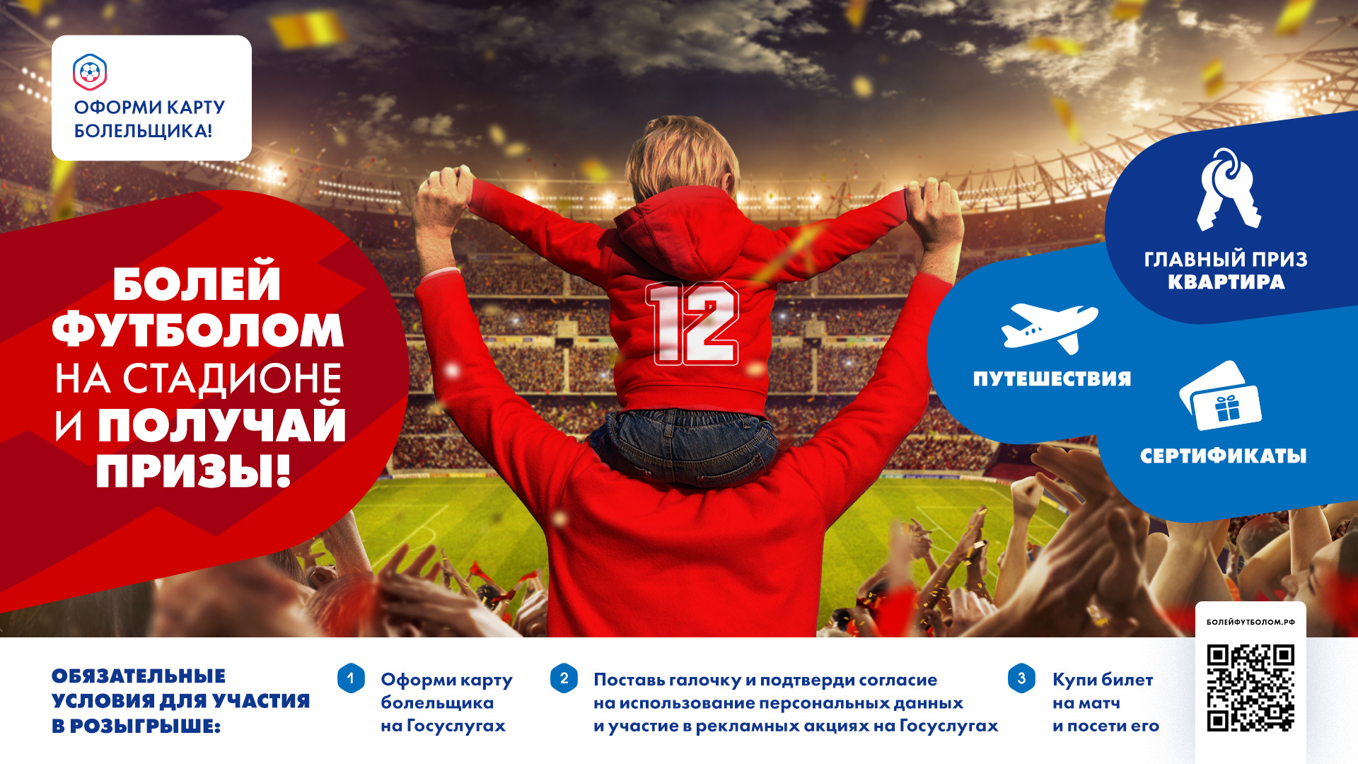 2 марта РФС запустил розыгрыш для владельцев карт болельщика. Чтобы стать участником акции, нужно оформить карту болельщика на портале «Госуслуги», дать согласие на участие в рекламных акциях, купить билет или абонемент на футбол и посетить матч. Главный приз – квартира в ближнем Подмосковье. Также у болельщиков есть возможность выиграть сертификаты на 40 тыс. руб. на путешествия, на 30 тыс. руб. на покупку техники и сертификаты до 3 тыс. руб. на покупки у партнеров розыгрыша. Всего будет разыграно более 19 тыс. призов.