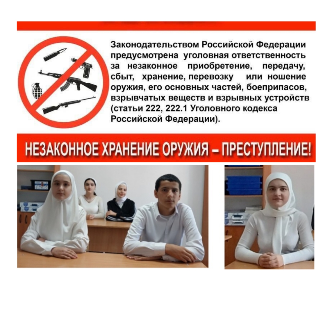 В рамках проведенного мероприятия приведены примеры совершенных преступлений в сфере незаконного оборота оружия на территории РФ, а также сроки наказания для лиц, привлеченных к уголовной ответственности за совершение указанного деяния по статьям 222 и 222.2 УК РФ.